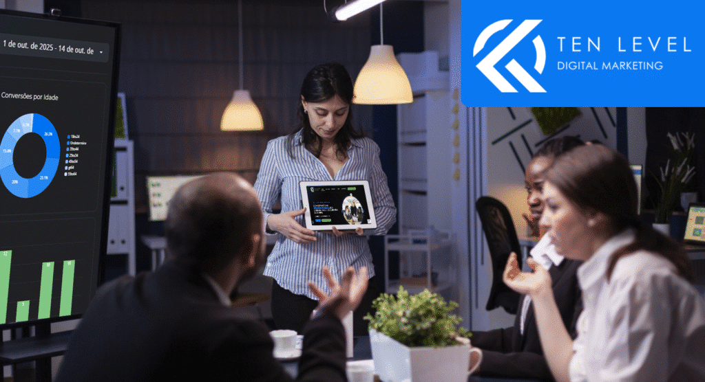 A Ten Level é especializada em performance digital — combinando tráfego pago, SEO, branding e automação — para posicionar seu negócio entre os primeiros resultados e aumentar suas vendas de forma previsível.